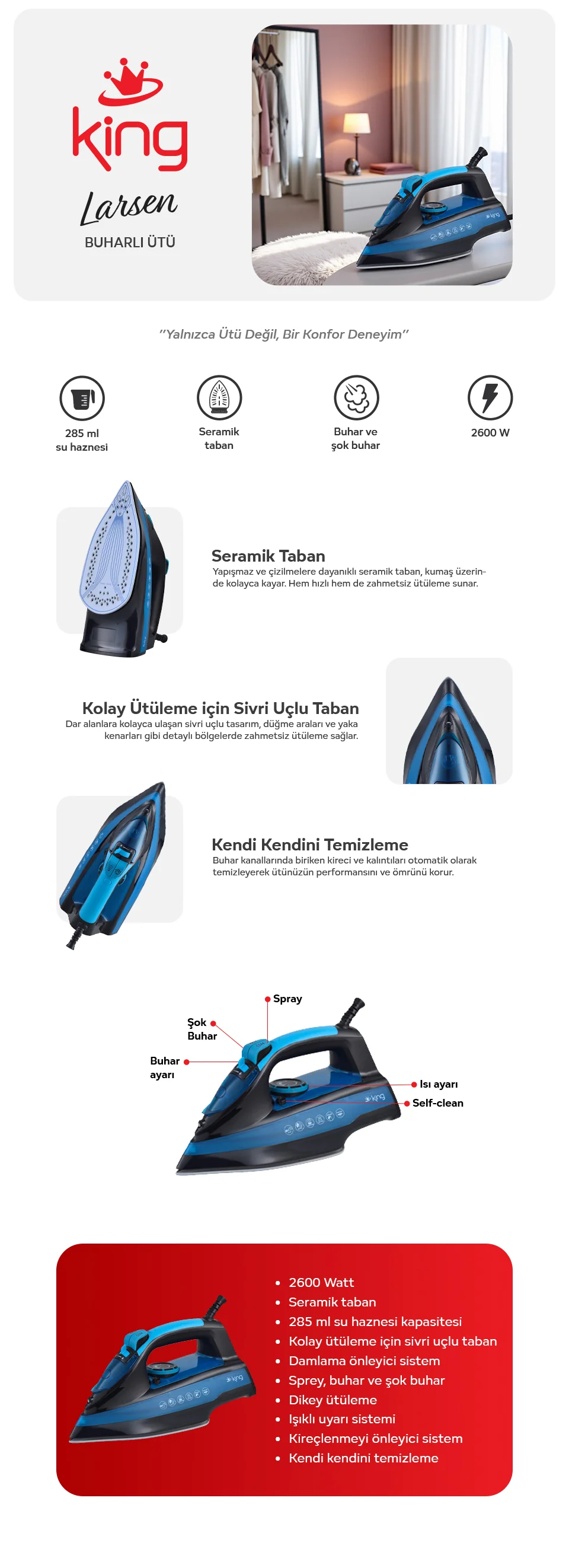 KİNG KBÜ700 Larsen Buharlı Ütü-Mavi